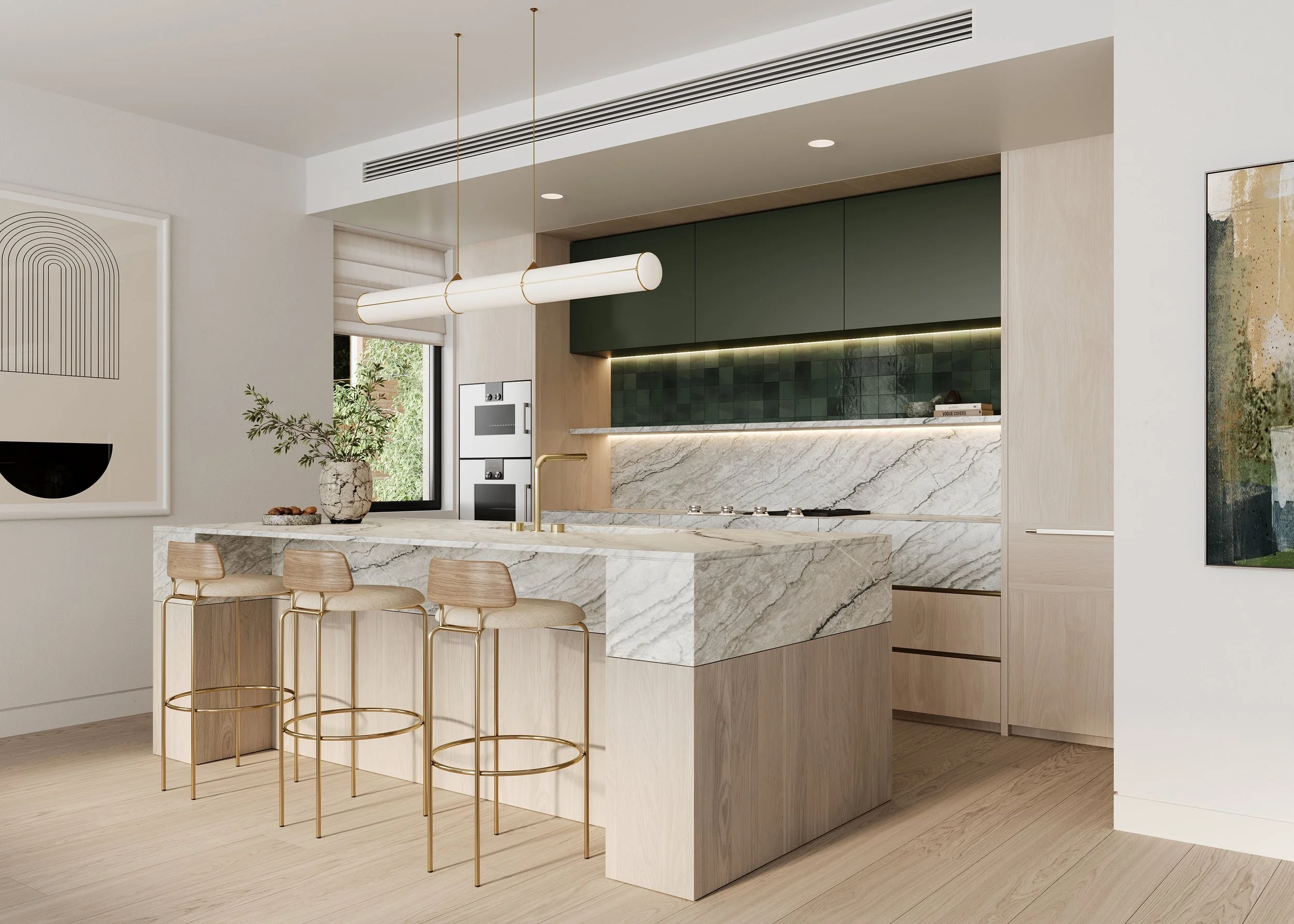 Premium appliances by Gaggenau and Fisher & Paykel, paired with timeless tapware, smooth marble surfaces and warm timber cabinetry, complete a space that elevates everyday living with quiet sophistication.