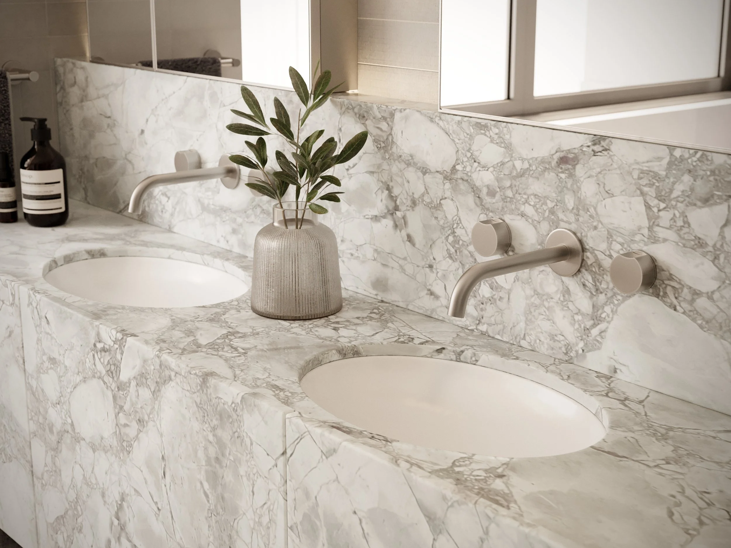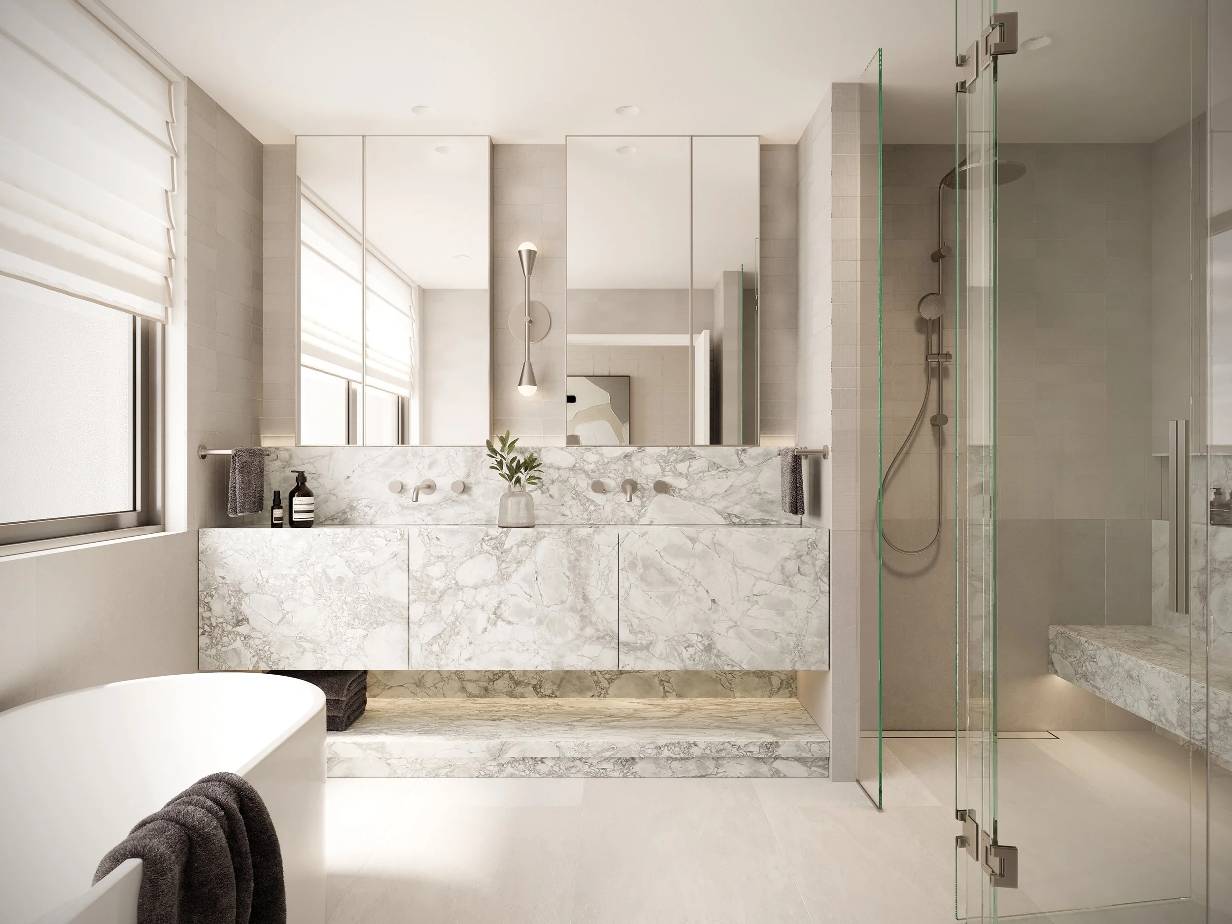 The master ensuite is a sanctuary of refined elegance, where cool grey tones capture the daylight streaming through expansive windows. A freestanding bath is positioned to take advantage of this natural light, while the generous shower recess, framed in Calacatta marble, features an oversized rainfall showerhead and discreet cabinetry. The all-stone vanity, with double underslung oval basins, splash, drawer fronts, and shelf, is complemented by premium nickel wall-mounted tapware. Mirror cabinets with hinged leaves provide practical detailing, while a sculptural wall sconce highlights negative space, completing a contemporary yet timeless expression of bathroom design.
