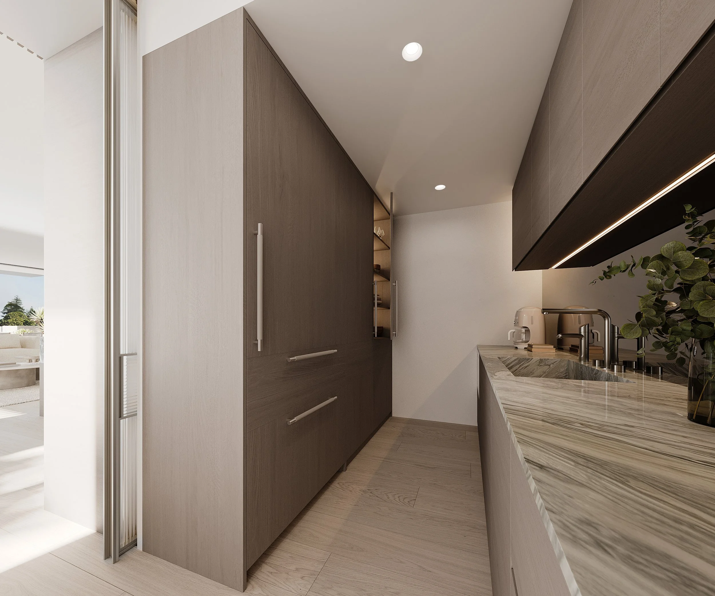 Rich veneer joinery is paired with stone-clad benchtops, splashback, and a sculptural rangehood shroud, while a generous island bench anchors the space for entertaining. A horizontal dado detail continues into the metal framing of the glass wine enclosure. Fully concealed sliding fluted glass doors connect seamlessly to the scullery—complete with a second integrated fridge-freezer and dishwasher—and to the bedrooms beyond. At the rear, a smoky mirror splashback enhances light and depth, completing a kitchen defined by precision, elegance, and function. Beyond the main kitchen area, a discreet butler’s pantry offers a hidden haven for culinary preparations and all the accoutrements of daily life.