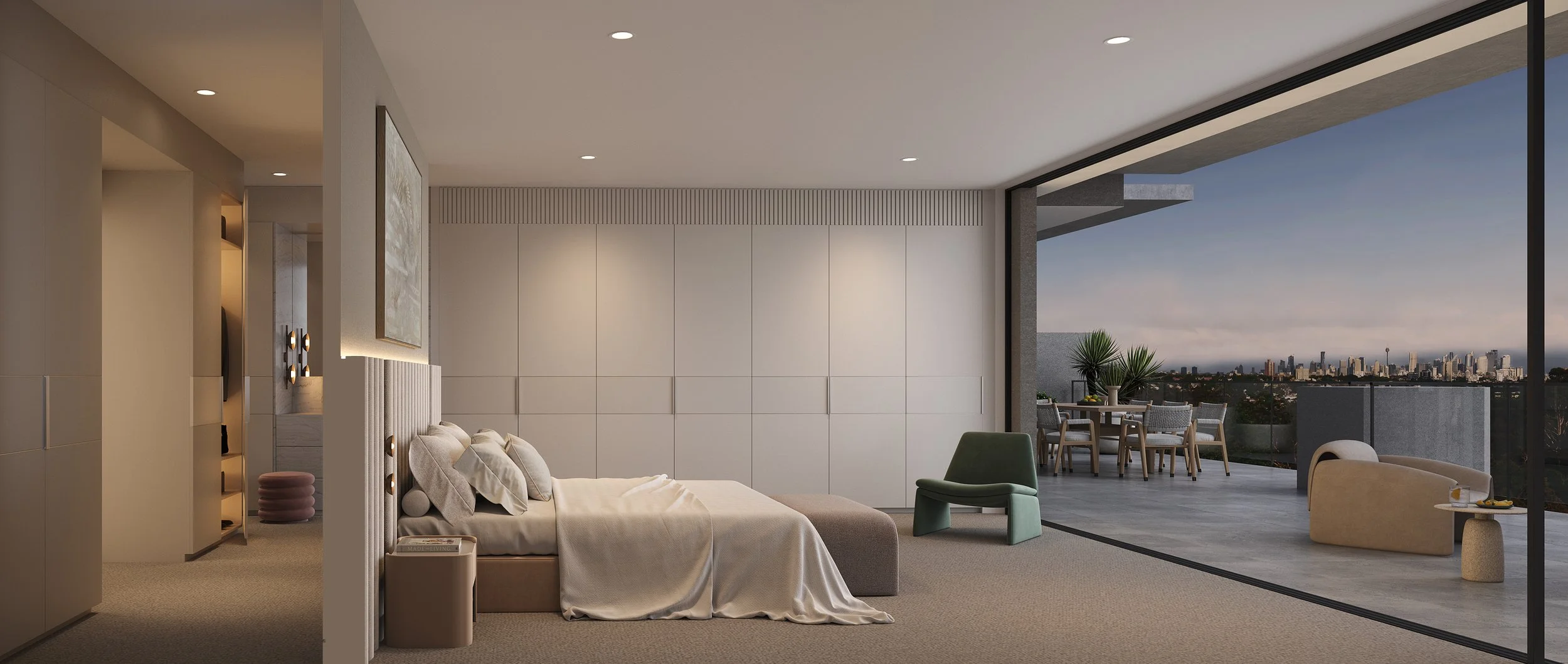 The master bedroom opens to a private balcony with sweeping views of the city skyline, while a walk-in wardrobe leads seamlessly through to the master ensuite. A custom dresser with stone top, mirrored splashback, and feature sconce enhances the sense of refinement. The bespoke bolstered bedhead, upholstered in luxury fabric, is framed by his-and-hers sconces and a concealed LED light, casting a soft, ambient glow that completes the sanctuary-like atmosphere.