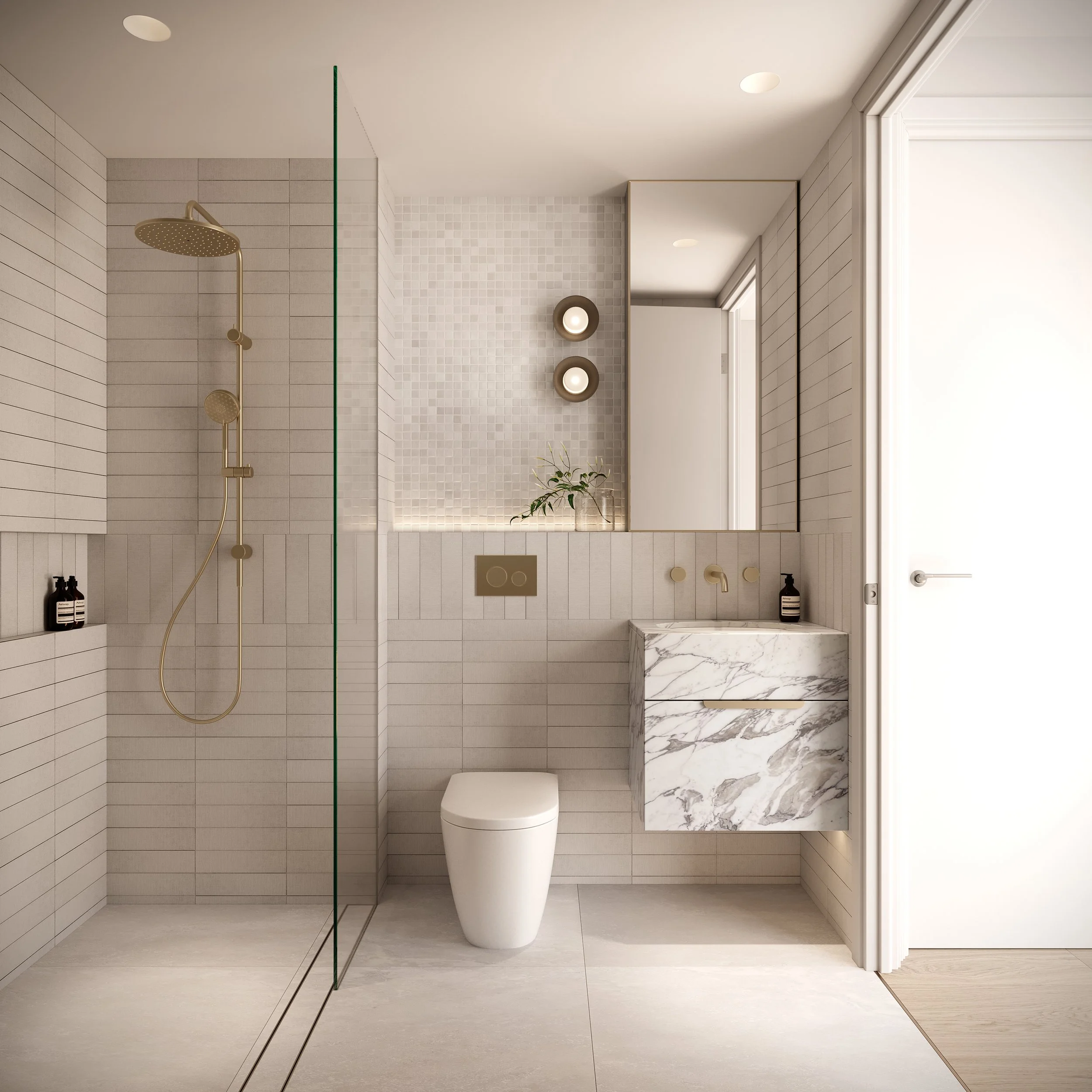 The bathrooms at Otium are a crafted sanctuary where soft grey shades of Calacatta Vagli create a space of pure relaxation. The walls feature an interplay of geometry through porcelain mosaic tiles in pale hues. Brass fittings, including a luxurious rainfall showerhead, add a touch of warmth and sophistication.